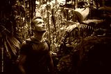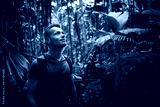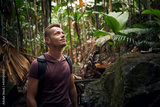 Young man with backpack discovering jungle. Traveler in tropical rainforest in Seychelles..