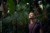 Young man with backpack discovering jungle. Traveler in tropical rainforest in Seychelles..
