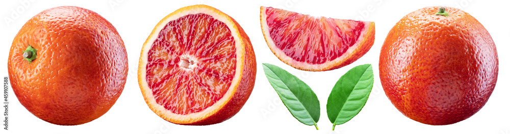 Set of red orange, orange slices and orange leaves. File contains clipping paths.