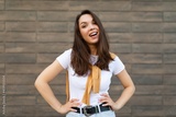 Portrait of young beautiful positive happy brunette woman standing against brown wall in the street and wearing stylish outfit