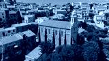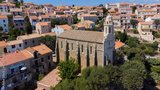 Aerial view of Cargèse and the Church of Saint Spyridon in the south of Corsica, France - Orthodox church built on a hillside above the Mediterranean Sea in a village of Greek origins