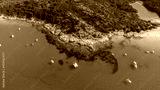 Aerial view of Loto Beach in the Agriates Desert northwest of Saint Florent near the Cap Corse, Corsica, France -Leisure boats moored in azure waters by a rocky shoreline in the Mediterranean Sea
