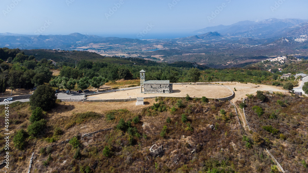 Aerial view of the church of Saint Michael of Murato in Upper Corsica, France - Polychromic stone church with a green and white bell tower in the mountains