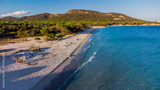 Aerial view of Palombaggia Beach in the South of Corsica, France - Famous pine tree forest on the island of Corsica, near the turquoise waters of the Mediterranean Sea