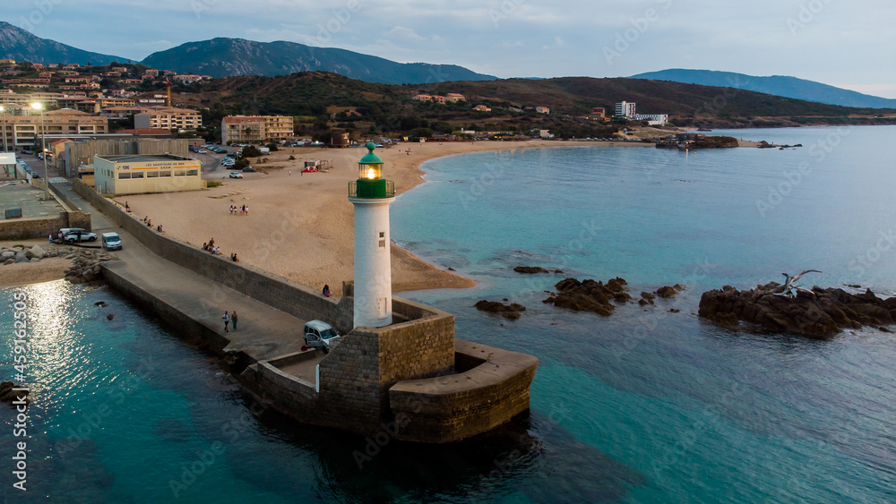 Aerial view of the lighthouse of Propriano in the South of Corsica, France - Small coastal town in the Mediterranean Sea