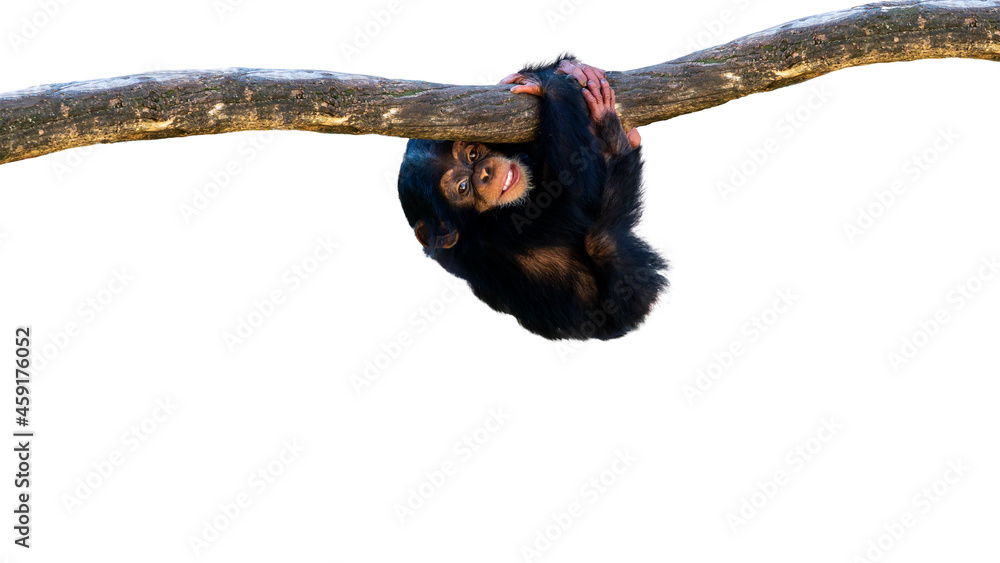 Cute baby chimpanzee hanging onto a tree branch isolated on a white background with room for text