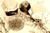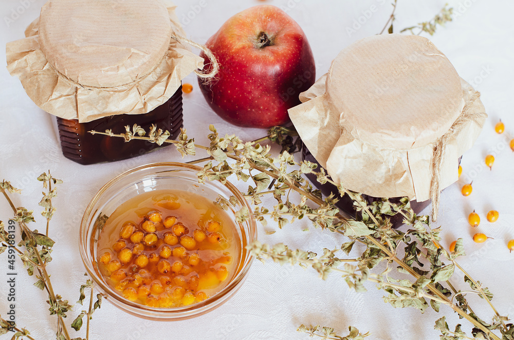 Sea buckthorn and apple marmalade - jam in a glass jar. Homemade confiture is any fruit jam, marmalade, pasta, or stewed fruit in thick syrup. Close-up