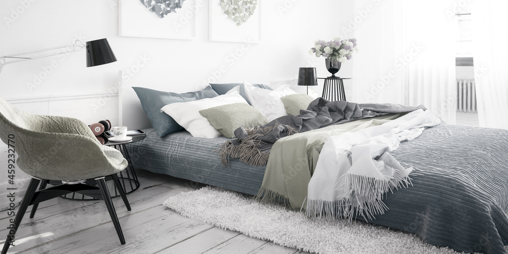Cosy Summer Colors Bedroom By Daylight - panoramic black and white 3D Visualization