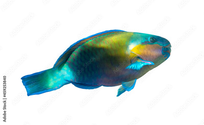 Rusty parrotfish (Scarus ferrugineus) isolated on white background, Red Sea, Egypt. Bright tropical coral fish, close up, side view, cut out.