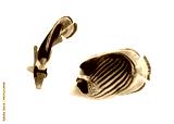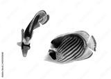 Pair of Raccoon Butterflyfish (Chaetodon lunula, crescent-masked, moon butterflyfish) isolated on white background. Two tropical fish with black and yellow stripes. Close-up, side view, cut out.