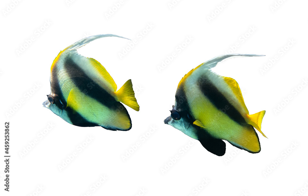 Pair of Pennant coralfish (Heniochus acuminatus, longfin bannerfish) isolated on white background, Red Sea, Egypt. Two tropical striped black and yellow fish. Close-up, side view, cut out.