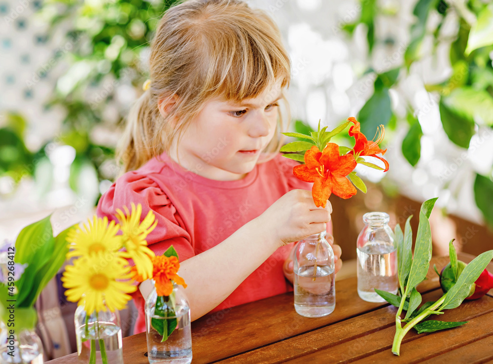 Little preschool girl making flower bouquet at home. Toddler child putting colorful garden summer flowers in small bottles with water. Home activities for kids. Flowers in rainbow colors. Happy child.