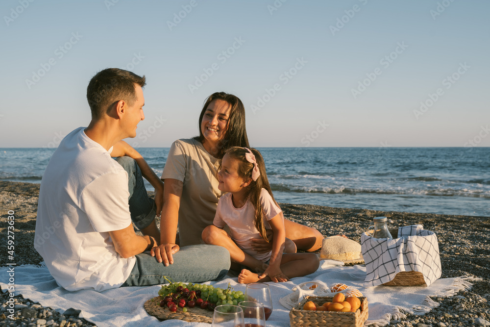 Summer family leisure picnic lunch with fruits by the seaside. Happy people eating healthy food on the spending time together outdoor.