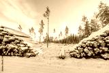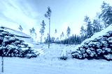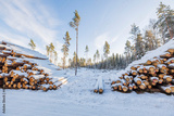 View of snowy wood logs on rare pine trees and pale blue sky with white clouds background. Sweden.