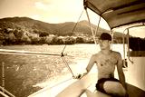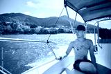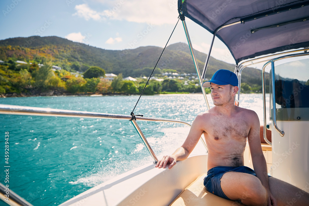 Man enjoying travel on bow of motorboat against beautiful coast of Praslin Island in Seychelles.
