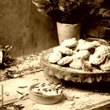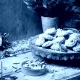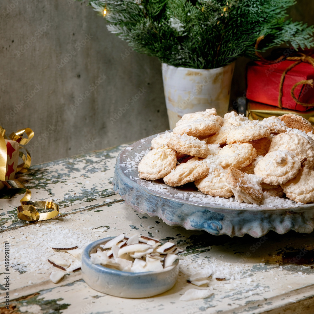 Christmas coconut gluten free cookies with coconut flakes on Christmas table.