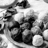 Raw vegan coconut chocolate candy balls over white with eucalyptus branches