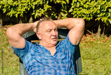 Portrait of tired mature man in the garden. Mature people lifestyle concept.