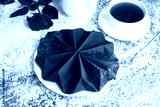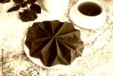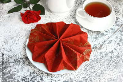 Festive table setting. Red paper napkin folded, a cup of tea, red rose. Romantic dinner.