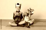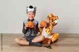 Cute little girl and boy in giraffe and wolf costume play at home. Halloween party