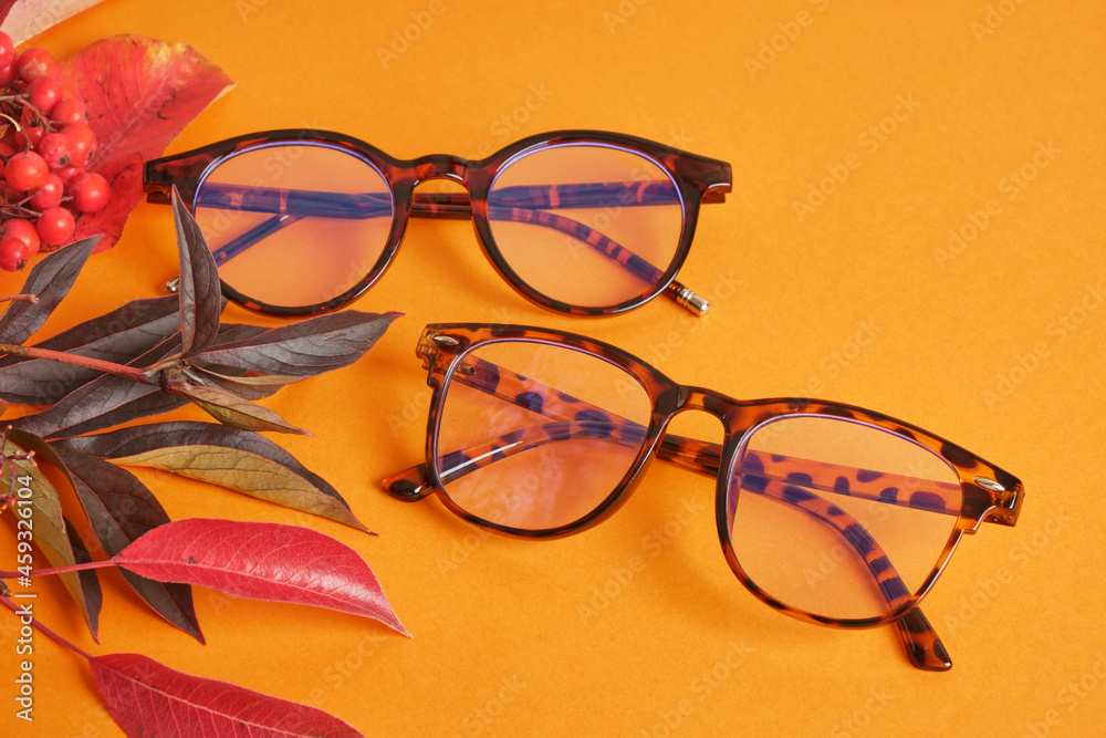 eye glasses nad red autumn leaves on orange background copy space