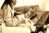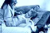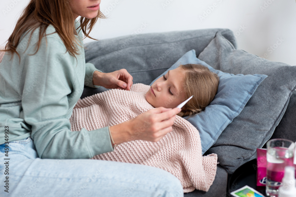 Mom sits next to her daughter and looks at the thermometer after taking her temperature