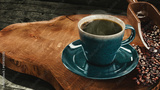 Hot Coffee in Rustic Cup with Coffee Beans on Wood Surface with Room for Copy