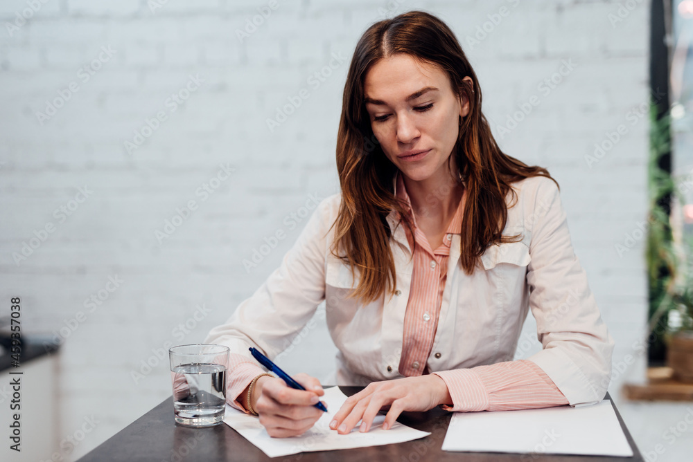 Woman doctor sits at her desk and writes with a pen on a sheet of paper