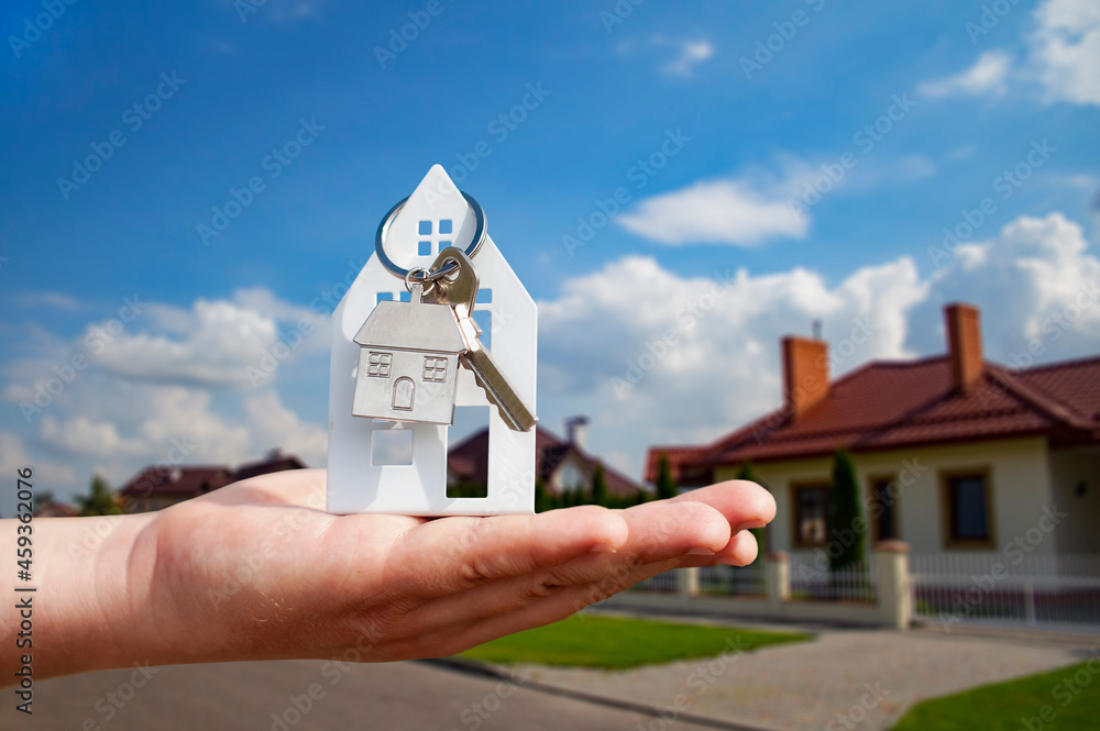 Man holds the keys to the house in his hands against the backdrop of residential buildings. Concept for buying and renting apartments.