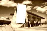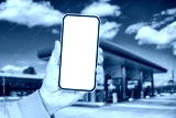 A man holds a close-up of a smartphone with a white screen in his hands against the backdrop on a gas station. Technology mockup for apps and websites.