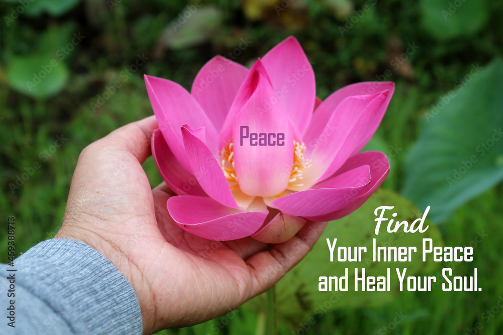 Single word - peace on pink lotus flower or Nelumbo nucifera blossom in hand. With inspirational quote message - Find your inner peace and heal your soul. Self healing and spirituality concept.