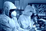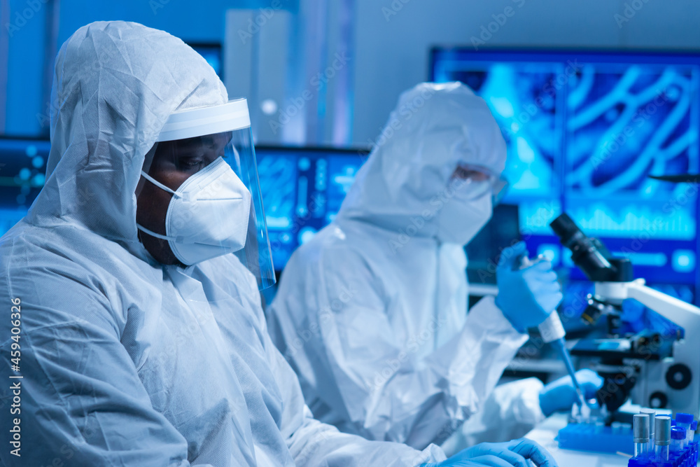African-american doctor in protective suit is doing a science experiments and developing vaccine in a modern lab. Laboratory assistant workplace. The concept of science and medicine.