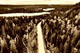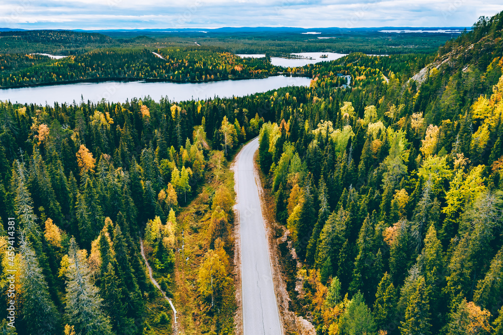 Aerial view of rural road in yellow and orange autumn forest with blue lake in Finland