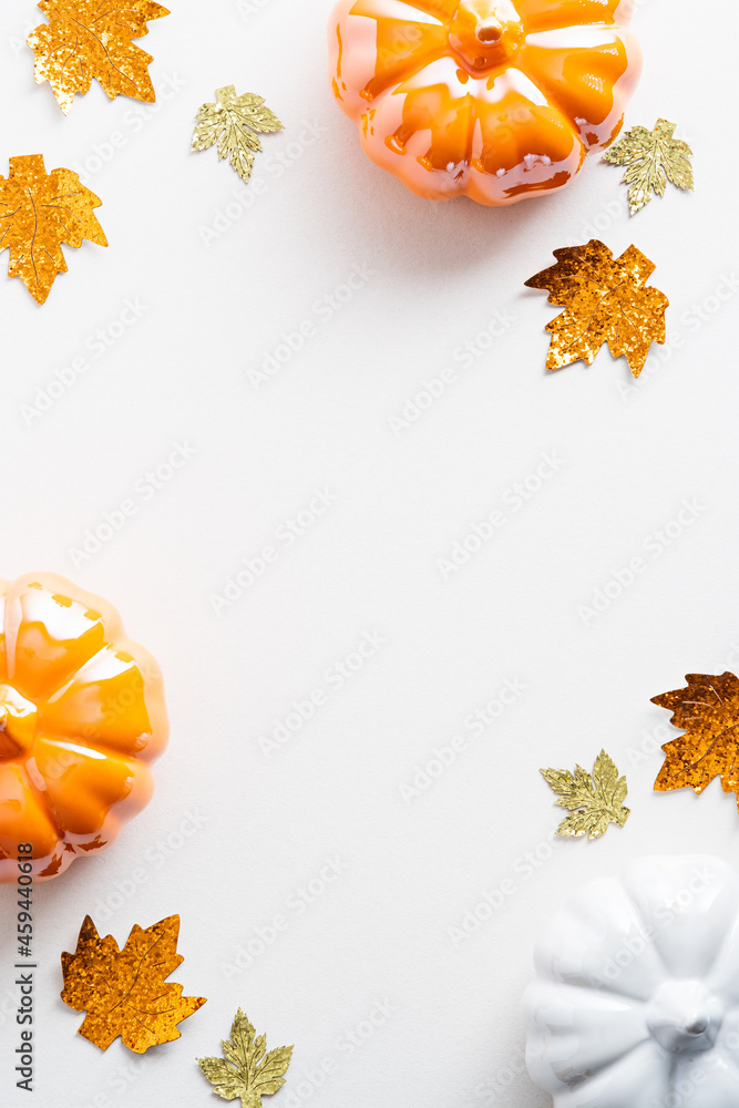 Autumn flat lay composition with pumpkins and maple leaves on a white background. Autumn, fall, Thanksgiving concept.