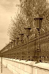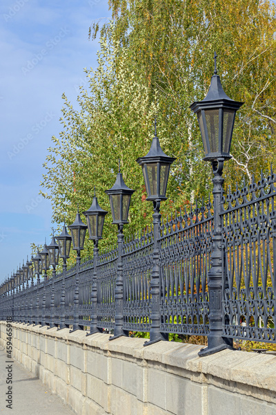 Metal fence of the territory of the Orthodox cemetery on an autumn day