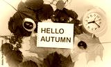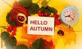 Notepad with the words Hello, autumn and autumn leaves, clock in the background