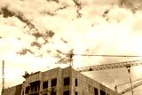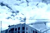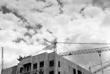 Large construction cranes over a plywood clad building structure, blue sky with gathering storm clouds, creative copy space, horizontal aspect