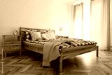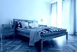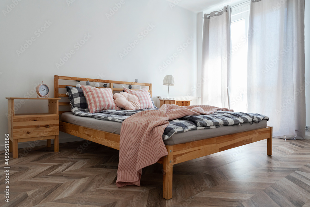 Cozy bedroom with comfortable bed, wooden floor and window with curtains. Stylish interior of room in apartment. Linen in grid and pillows with blanket.