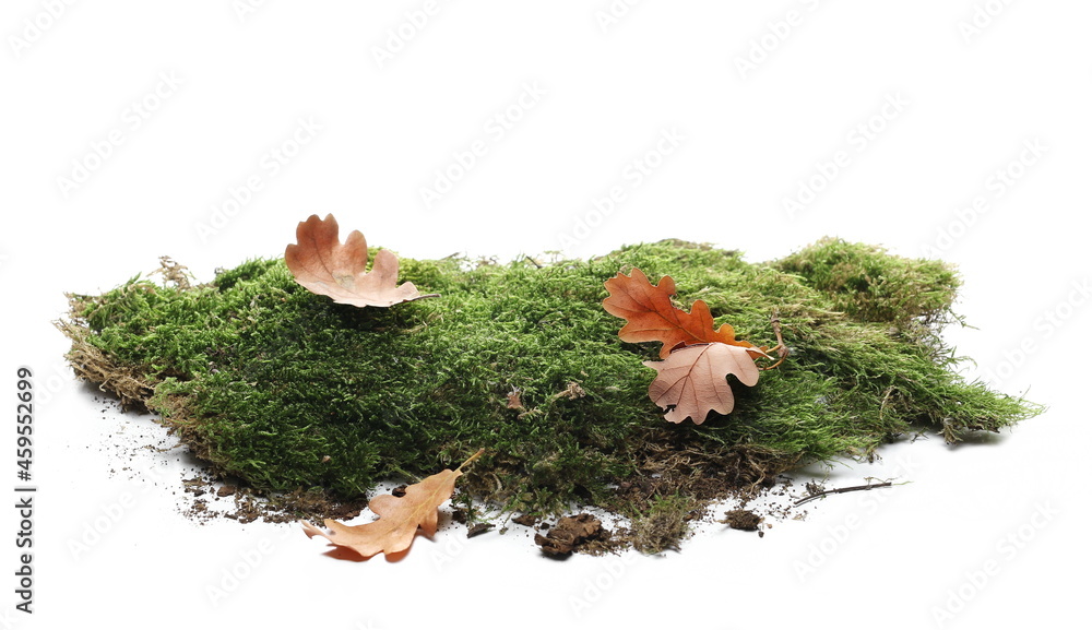 Autumn oak yellow leaves on green moss isolated on white background and texture, side view