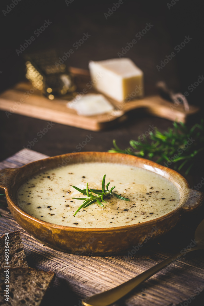 Bowl of parmesan cheese soup with rosemary on wooden background, vertical with copy space