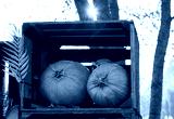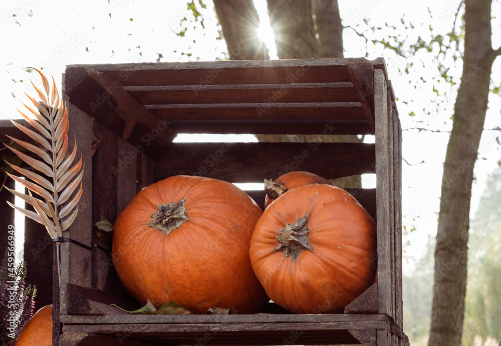 Pumpkins in a wooden box with autumn decoration outdoors with sun. Halloween pumpkin and thanksgiving festive. Vegetables in october and november.