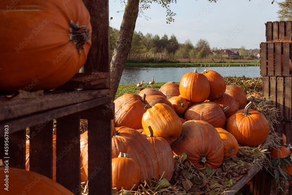 Autumn harvest of pumpkins for halloween holiday. Orange decoration in october and november. Season of pumpkin on wooden box. Outdoors.