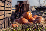 Pumpkins on a hay on a farm in the village. Autumn harvest of orange vegetables for thanksgiving and haloween. Natura and wooden boxes with food.