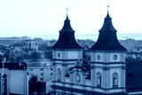 Sunset view to historic center and Cathedral of Resurrection of Christ from City Hall building. Ivano-Frankivsk, Ukraine
