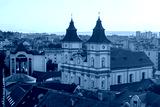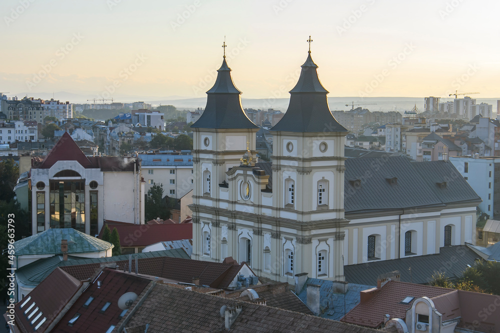 Sunset view to historic center and Cathedral of Resurrection of Christ from City Hall building. Ivano-Frankivsk, Ukraine