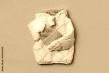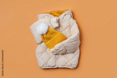 Kids warm puffer jacket with yellow hat on orange background. Stylish childrens outerwear. Winter fashion outfit