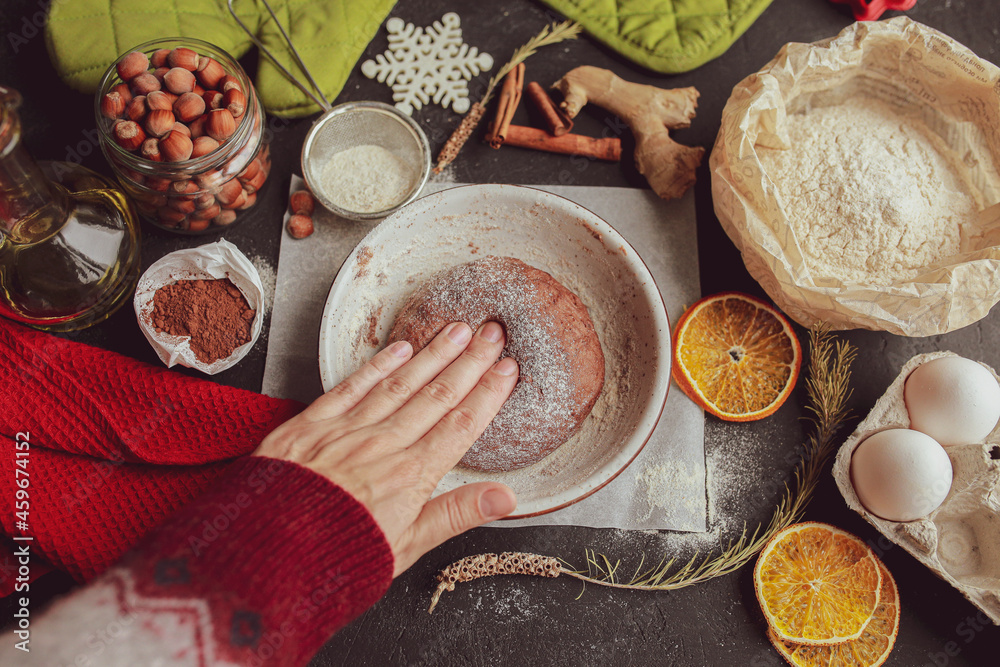 Cooking Christmas gingerbread.Making chocolate chip cookie dough for Christmas. Dough for Christmas. Cooking gingerbread for the new year. DIY gingerbread.Cookie Christmas Gingerbread Together