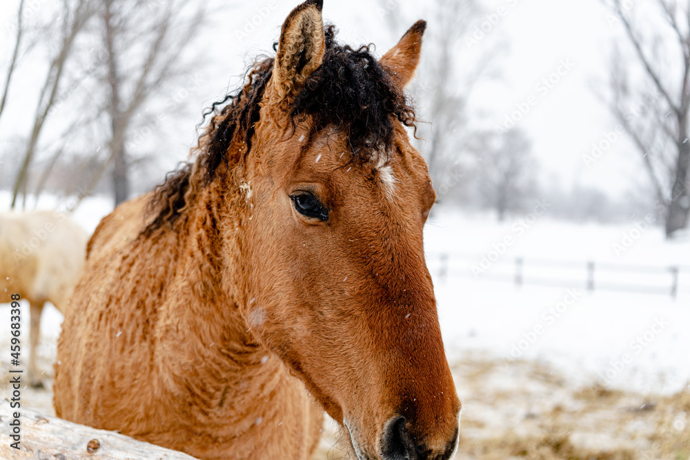 Portrait of a beautiful curly brown horse in winter. Snowy