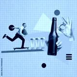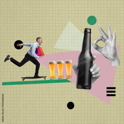 Contemporary art collage of man, employee joyfully running into weekend. Beer party