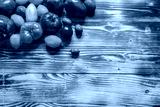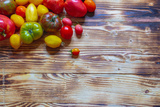 Different types of tomatoes. Black, orange, yellow, red tomato fruits on a wooden table